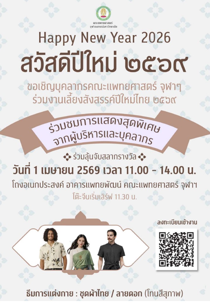 Happy New Year 2026 สวัสดีปีใหม่ ๒๕๖๙ ขอเชิญบุคลากรคณะแพทยศาสตร์ จุฬาๆ ร่วมงานเลี้ยงสังสรรค์ปีใหม่ไทย ๒๕๖๙ ร่วมชมการแสดงสุดพิเศษ จากผู้บริหารและบุคลากร ร่วมลุ้นจับสลากรางวัล วันที่ 1 เมษายน 2569 เวลา 11.00 - 14.00 น. ณ โถงอเนกประสงค์ อาคารแพทยพัฒน์ คณะแพทยศาสตร์ จุฬาฯ โต๊ะจีนเริ่มเสิร์ฟ 11.30 น.