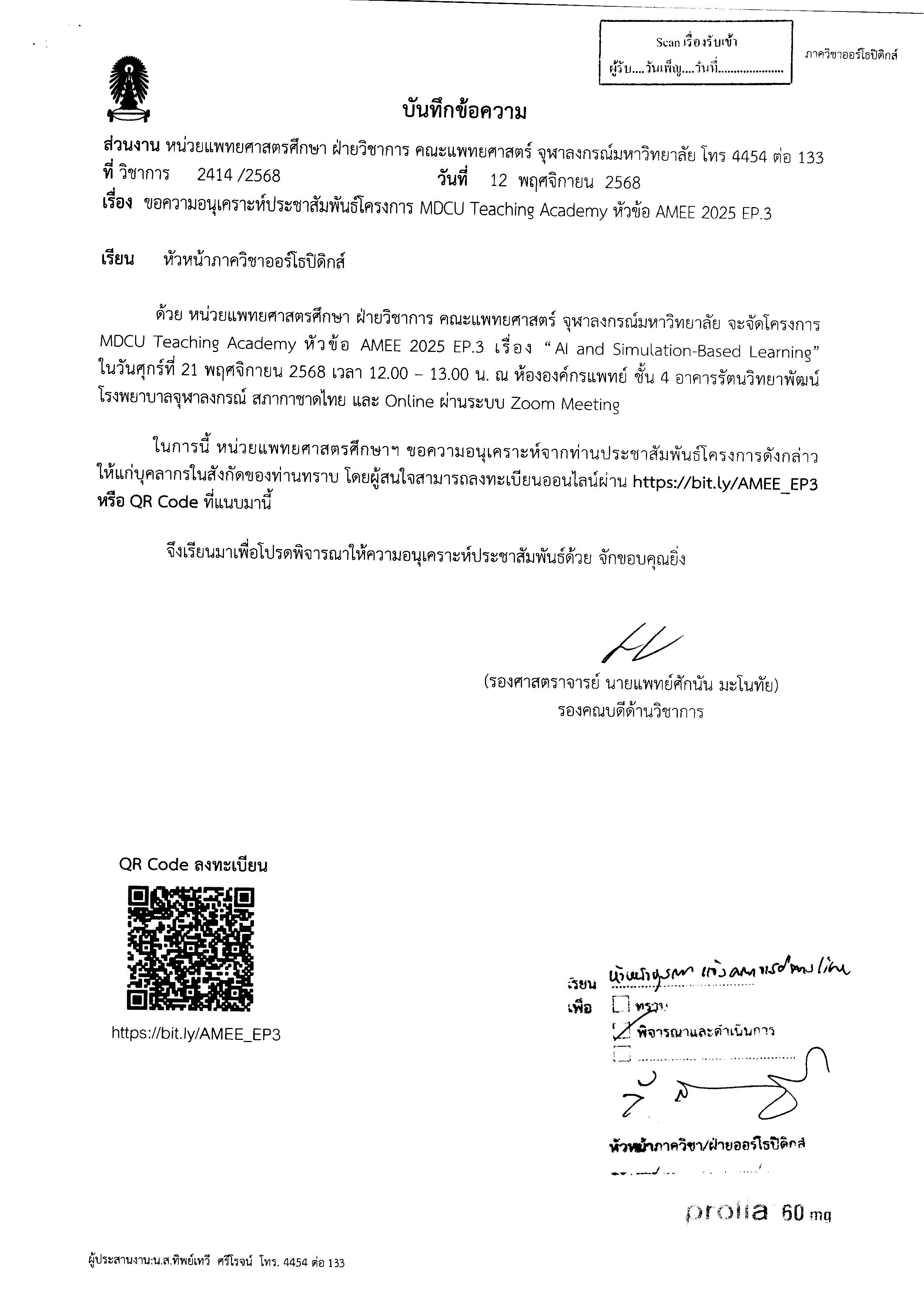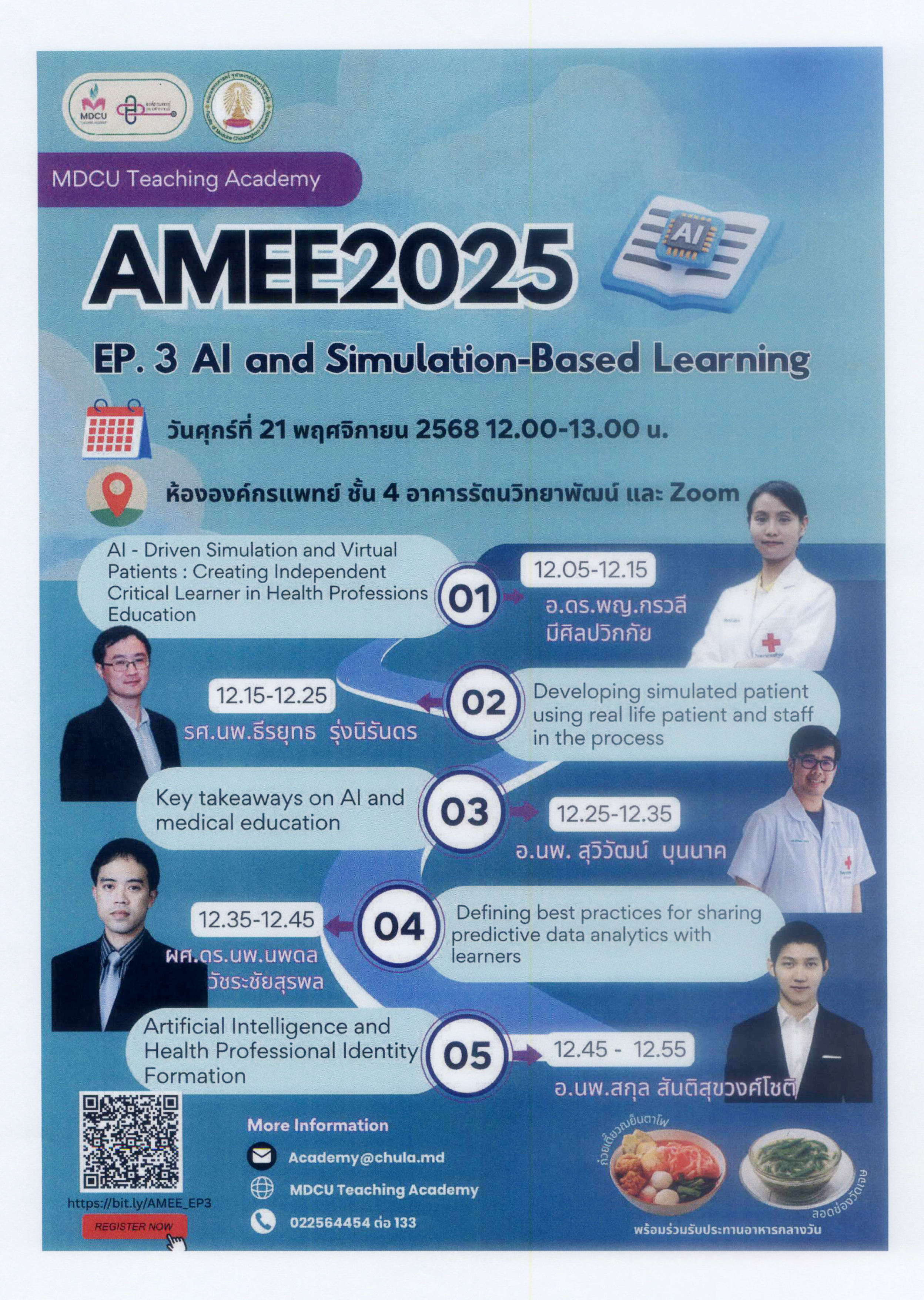 ประชาสัมพันธ์โครงการ MDCU Teachnig Academy Topic: AMEE 2025 EP.3 เรื่อง "AI and Simulation-Based Learning" On Friday 21st November 2025 at 12.00 - 13.00 am. ห้ององค์กรแพทย์ ชั้น 4 อาคารรัตนวิทยาพัฒน์ และ Online via Zoom Meeting