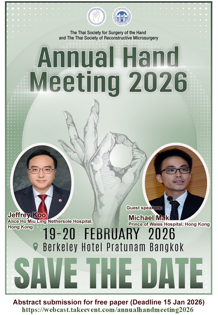 ชมรมศัลยแพทย์ทางมือแห่งประเทศไทย ขอเชิญเข้าร่วมประชุมวิชาการ the 4th Annual Hand Meeting 2026 ระหว่างวันที่ 19-20 กุมภาพันธ์ 2569 ณ โรงแรม Berkeley ประตูน้ำ กรุงเทพมหานคร : รายละเอียดเพิ่มเติมที่